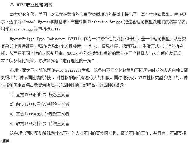 每個人從小到大都會積累這些自我認(rèn)識,別人的一句話評論,老師對你作文的評語都是你認(rèn)識自己的途徑。專業(yè)認(rèn)識自我的方法有很多,世界上幫助人們對自己進(jìn)行客觀的自我評估的方法有很多,如心理測試,應(yīng)用韋氏量表、瑞文智力測驗(yàn)智商,卡特爾的16PF的人格測試都是具體應(yīng)用。其中國際上最為流行的職業(yè)人格評估工具莫過于MTBI職業(yè)性格測試了。