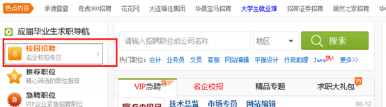 作為應(yīng)屆畢業(yè)生求職必上的求職網(wǎng)站,YJBYS求職網(wǎng)提供大量的名企校園招聘網(wǎng)申入口,你可以你可以通過(guò)點(diǎn)擊在網(wǎng)站首頁(yè)頂部導(dǎo)航欄“找工作”進(jìn)入企業(yè)、事業(yè)單位、知名企業(yè)招聘專區(qū),點(diǎn)擊“知名企業(yè)”便可得到各知名企業(yè)校招信息。當(dāng)然你也可以點(diǎn)擊首頁(yè)“校園招聘”或者輸入 直接進(jìn)入名企校招專區(qū)。