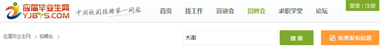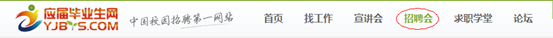 第一步:進(jìn)入應(yīng)屆畢業(yè)生網(wǎng)(www.isithink.com )首頁,在網(wǎng)站首頁頂部導(dǎo)航欄點(diǎn)擊“招聘會”,即可進(jìn)入“YJBYS招聘會查詢系統(tǒng)”,你也可以輸入 直接進(jìn)入該系統(tǒng);