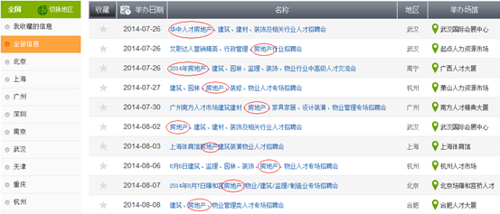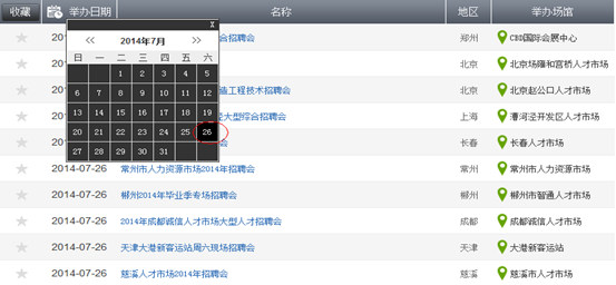 第三步:如果你希望找到某一天同時舉行的招聘會信息,你可以在舉辦日期那里選擇舉辦日期,例如選擇2014/7/26,你將可以得到26號當(dāng)天舉行的所有招聘會信息,結(jié)果如下: