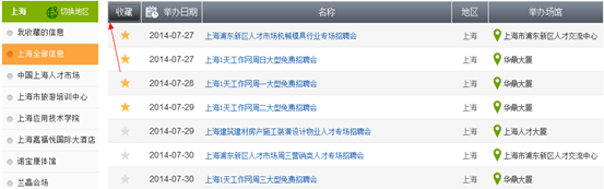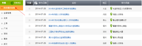 第五步:如果您想避免再次搜索自己感興趣的招聘信息帶來的麻煩,您可以在點(diǎn)擊招聘會舉辦日期前面的☆,然后在點(diǎn)擊“收藏”便可把您感興趣的信息收藏到“我收藏的信息”里面: