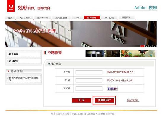 1、實習(xí)生網(wǎng)申地址:https://chinacampus.adobe.com(2012年網(wǎng)申已結(jié)束),點擊“實習(xí)生招聘”