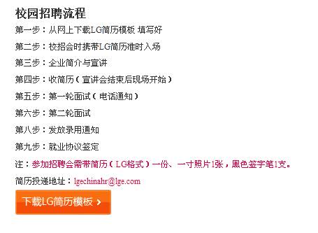 4、點擊進入后,可瀏覽LG公司校園招聘的詳細流程,并下載其專用的LG簡歷模板