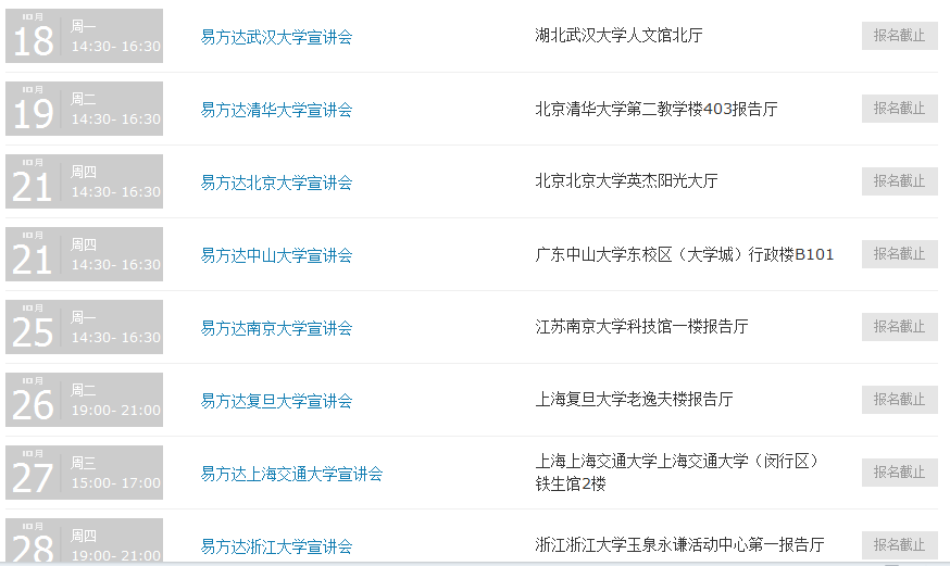注意:2014年校園宣講會(huì)未必如此,因此請(qǐng)經(jīng)常關(guān)注應(yīng)屆畢業(yè)生網(wǎng)宣講會(huì)查詢系統(tǒng),以便得到最新最準(zhǔn)確的易方達(dá)基金校園宣講會(huì)信息。