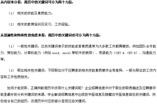 HR平均瀏覽一份簡(jiǎn)歷的時(shí)間不超過30秒,在這么短的時(shí)間內(nèi),HR主要是通過查看簡(jiǎn)歷中是否有相關(guān)的關(guān)鍵詞來(lái)進(jìn)行判斷。關(guān)鍵詞的作用尤其在網(wǎng)申簡(jiǎn)歷中更為明顯。如果你是應(yīng)聘互聯(lián)網(wǎng)行業(yè)相關(guān)度的職位,HR可能會(huì)對(duì)簡(jiǎn)歷中的“網(wǎng)站”、“流量”、“×××××.com”(網(wǎng)址域名)等關(guān)鍵詞比較敏感;如果你應(yīng)聘財(cái)務(wù)類職位,HR可能會(huì)對(duì)簡(jiǎn)歷中的“會(huì)計(jì)”、“財(cái)務(wù)管理”、“財(cái)務(wù)軟件”等關(guān)鍵詞比較敏感……所以在寫簡(jiǎn)歷前,你應(yīng)該針對(duì)應(yīng)聘的職位、公司甚至行業(yè),想一想需要在簡(jiǎn)歷中加上哪些關(guān)鍵詞,這些關(guān)鍵詞可以分別對(duì)應(yīng)到你的簡(jiǎn)歷的哪部分內(nèi)容,以什么樣的描述方式來(lái)呈現(xiàn)。