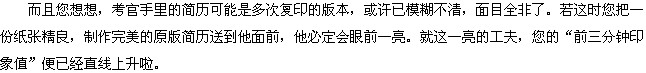 例子:清華大學(xué)會(huì)計(jì)系的幾位同學(xué)到某著名的國(guó)際會(huì)計(jì)師事務(wù)所面試。等了一會(huì)兒以后,主試官告訴他們,由于某些原因, 找不到他們的簡(jiǎn)歷了,問是否可以另外提供一份簡(jiǎn)歷。當(dāng)時(shí)只有一位同學(xué)多帶了一份簡(jiǎn)歷。后來那位同學(xué)被錄取了。從這件真實(shí)的事情中,你是否得到了一些啟示呢?