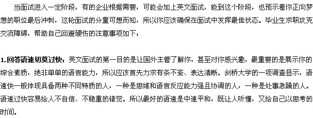 如果前面都很順利,最后一輪面試一般就是和公司的總裁面對(duì)面了。外企的總裁一般是老外,當(dāng)然面試就變成全英語(yǔ)的了。面試在求職過(guò)程中,可以說(shuō)是壓力最大的一個(gè)環(huán)節(jié)。而英語(yǔ)面試又是比較難的一環(huán),第三輪當(dāng)然是難上加難。總裁詢問(wèn)的問(wèn)題一般會(huì)和公司精神、企業(yè)文化、個(gè)人品質(zhì)、福利薪水有關(guān)。面對(duì)外國(guó)老板連珠炮似的提問(wèn),如果能回答得從容不迫、簡(jiǎn)明扼要,恰當(dāng)中肯,合乎口味,那么肯定會(huì)大大增加你的錄取機(jī)會(huì)。