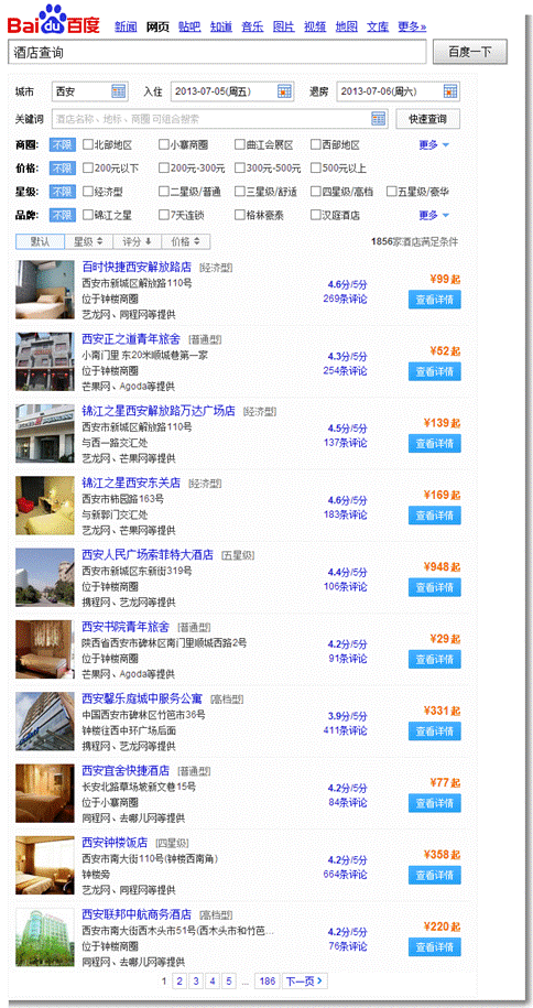 權(quán)威酒店查詢:https://jiudian.baidu.com/(百度酒店查詢),求職者可以事先查好來到西安后目的地附近的酒店名稱及所在位置,下車后直奔酒店訂好房間住下。下圖為百度酒店查詢頁面,供求職者參考。